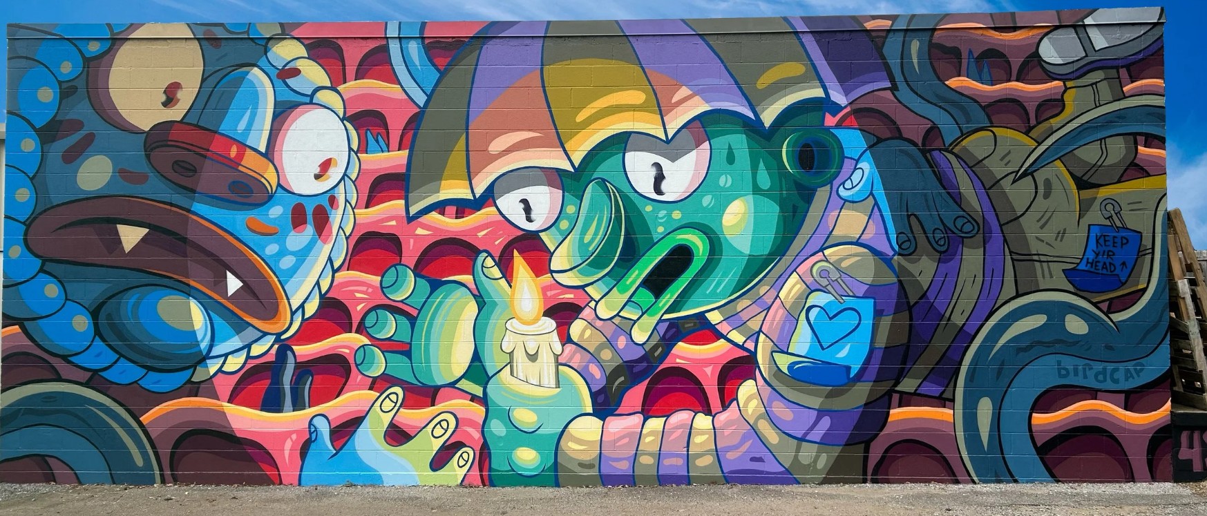 Birdcap, pseudonyme de Michael Roy, est un muraliste et artiste américain originaire du sud des États-Unis. Il a grandi près des bayous du Mississippi, un environnement qui a profondément influencé son imaginaire et l’atmosphère narrative de son travail.