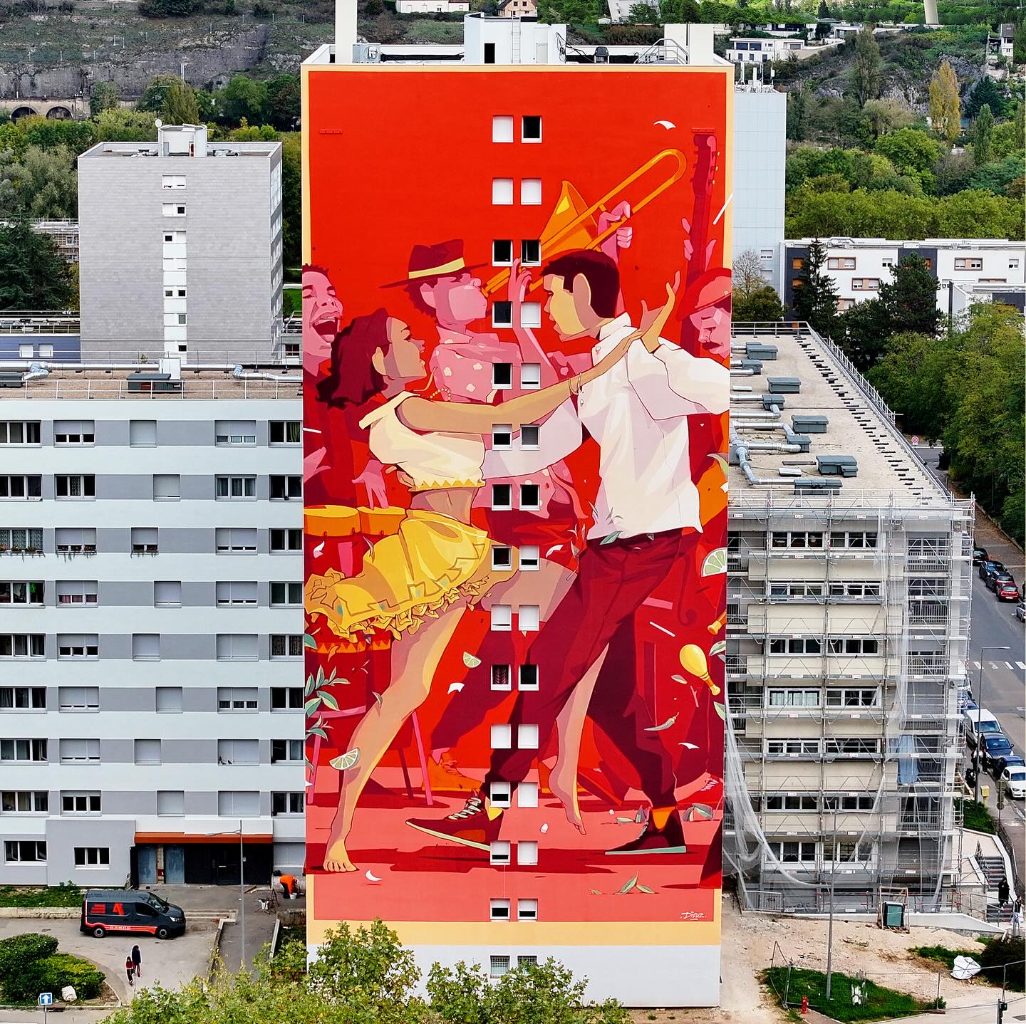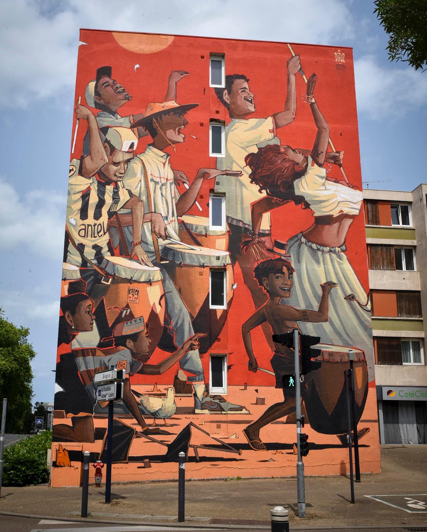 populaire. Les scènes qu’il compose sont marquées par lemouvement. Les personnages sont disposés en rythme, etracontent des histoires de migrations, d’origines et de cultures faisant directement écho aux racines familiales de l’artiste ainsi qu à son environnement social. Invité sur de nombreux projets en France et à l’étranger, l’artiste promeut et met en lumière le savoir vivre Méditérannéen.