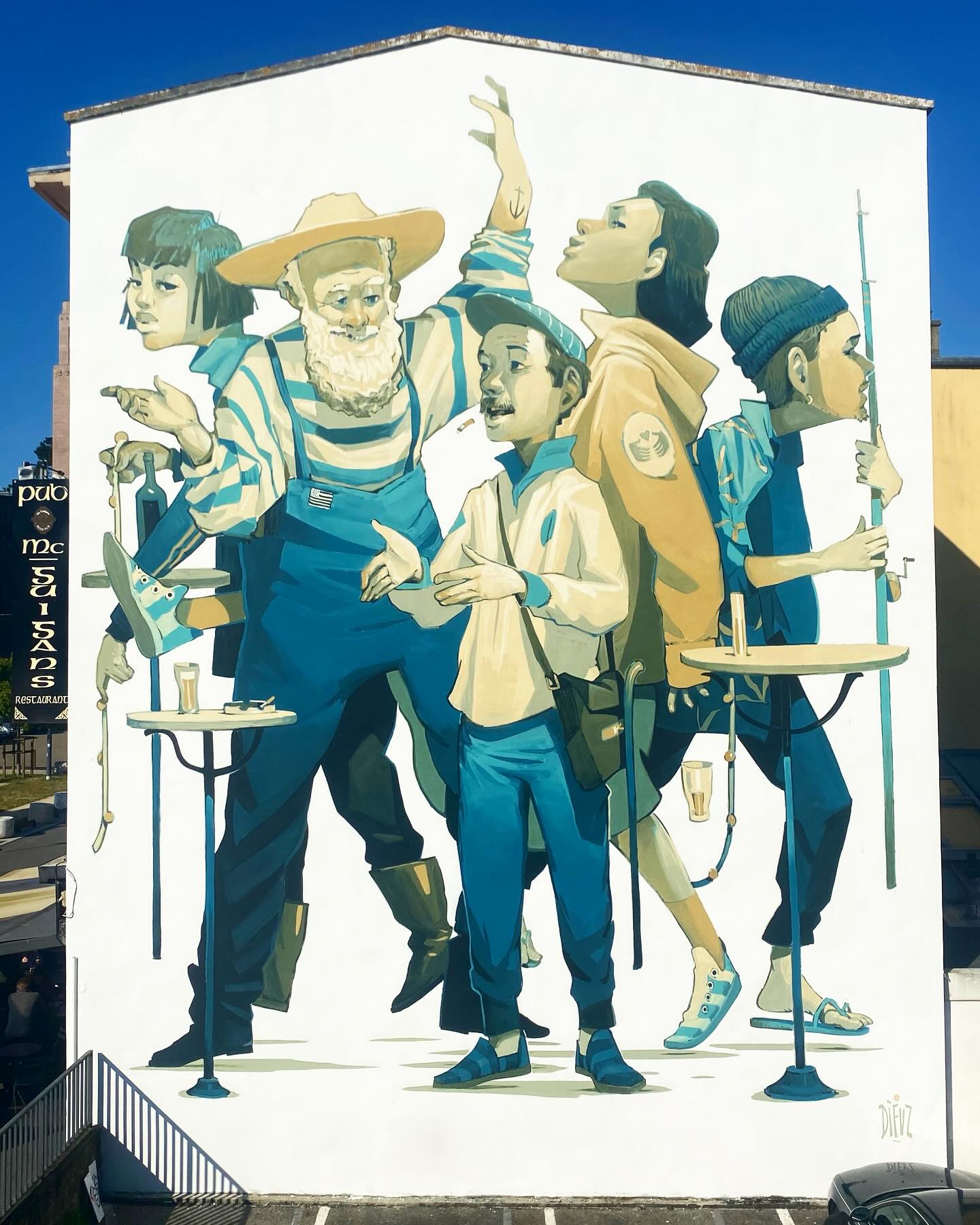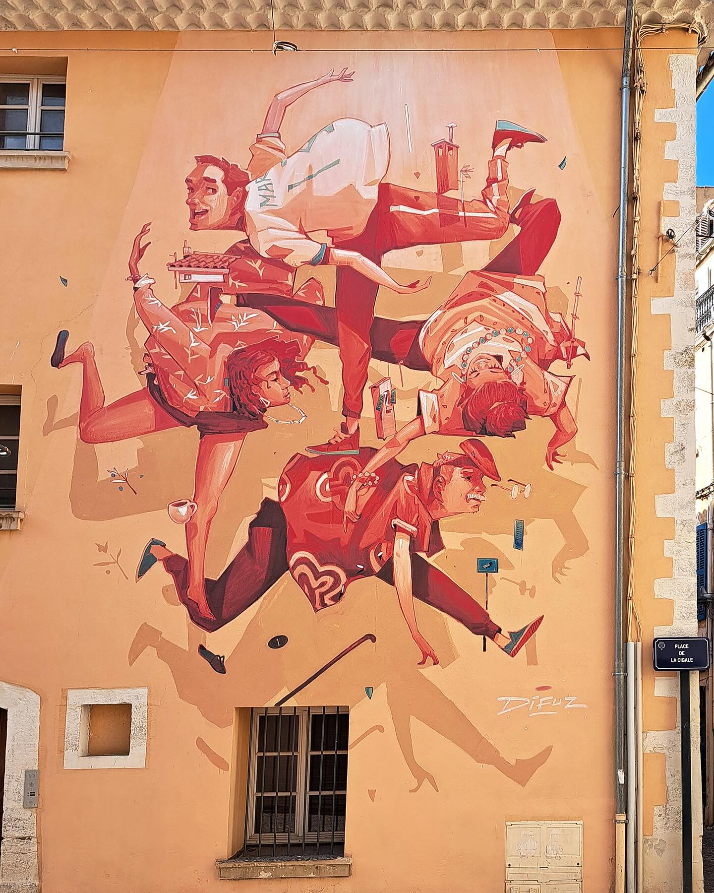 Diego Konicheckis plus connu sous le nom de Difuz, est un artiste peintre Marseillais issu de la scène graffiti. Il commence à peindre dans la rue au milieu des années 90, notamment avec son collectif «Ki Fait Ca ?» toujours actif dans le milieu urbain etculturel de la ville. Il développe depuis 20 ans une oeuvre figurative singulière, qui prend vie entre fresques grands formats et travail d’atelier. Nourri par le quotidien, il compose un univers narratif foisonnant, qui défend une vision d’un art engagé et