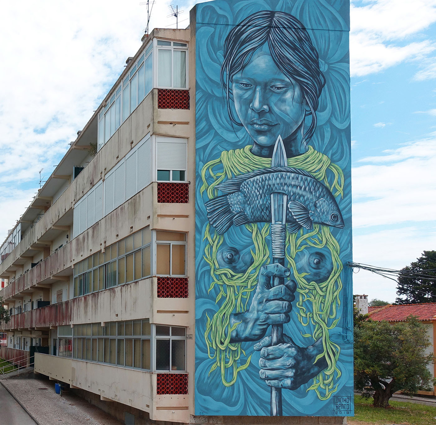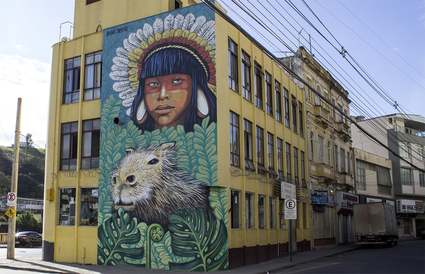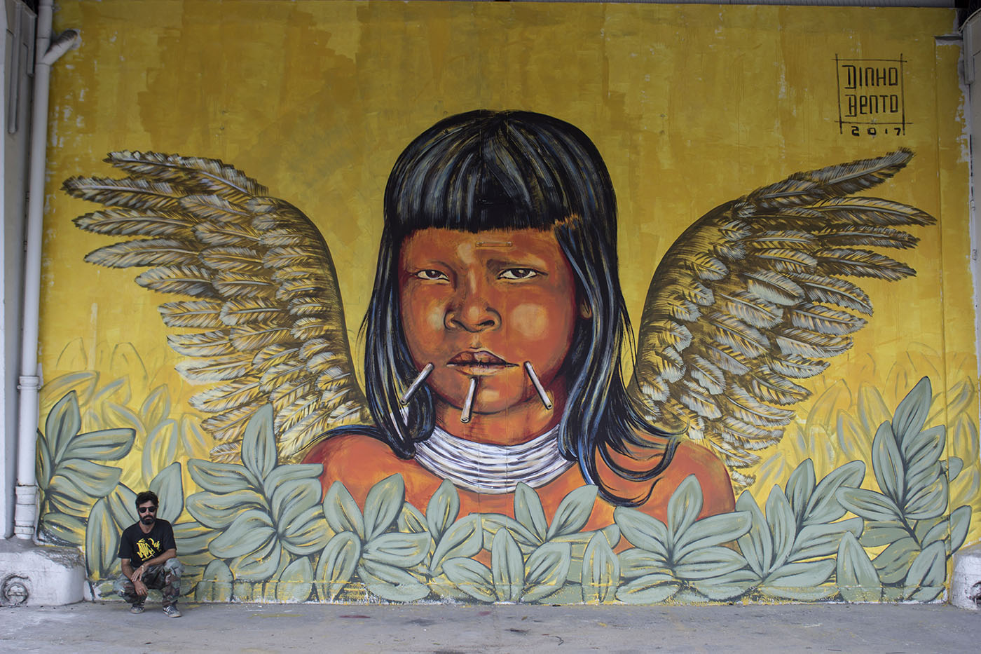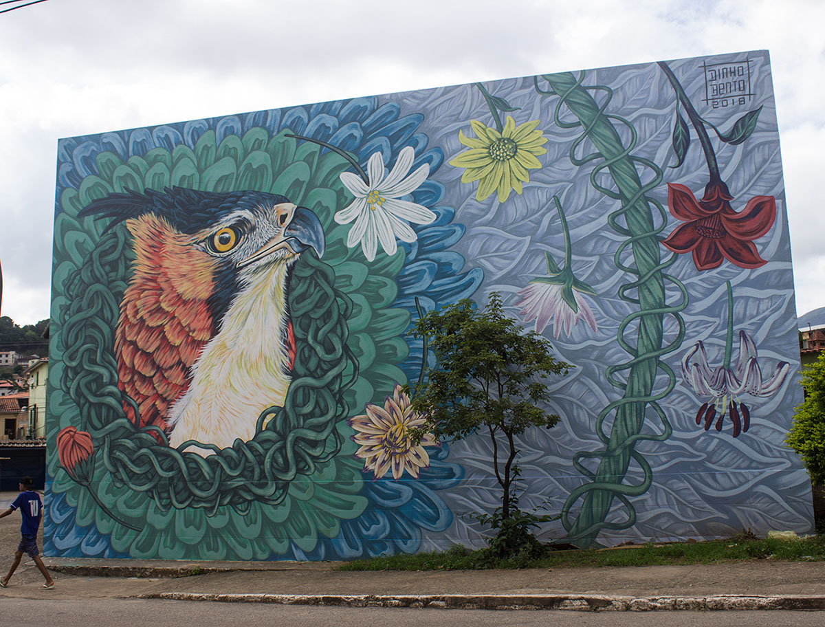 Reconnu internationalement comme muraliste, Dinho Bento réalise des projets dans plusieurs pays, tout en poursuivant une pratique d’atelier parallèle centrée sur la recherche technique et matérielle. Cette dualité entre art public et production en studio constitue un élément central de sa démarche, créant un lien esthétique et conceptuel entre ses fresques monumentales et ses œuvres sur toile.
