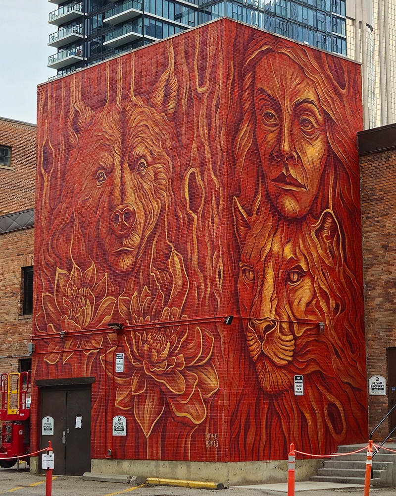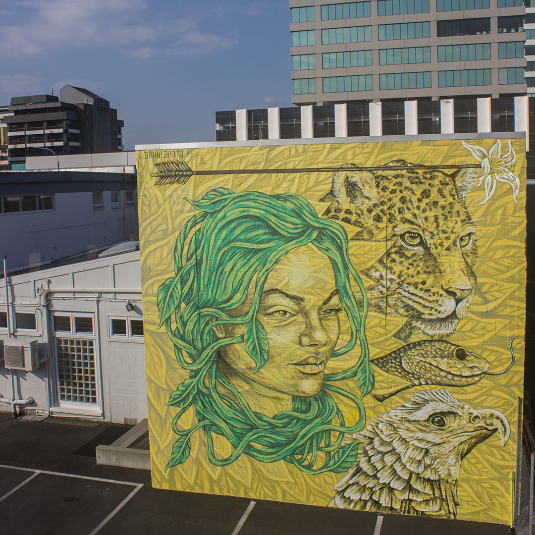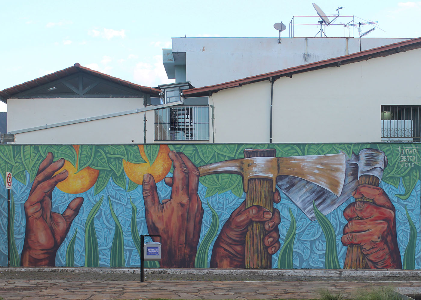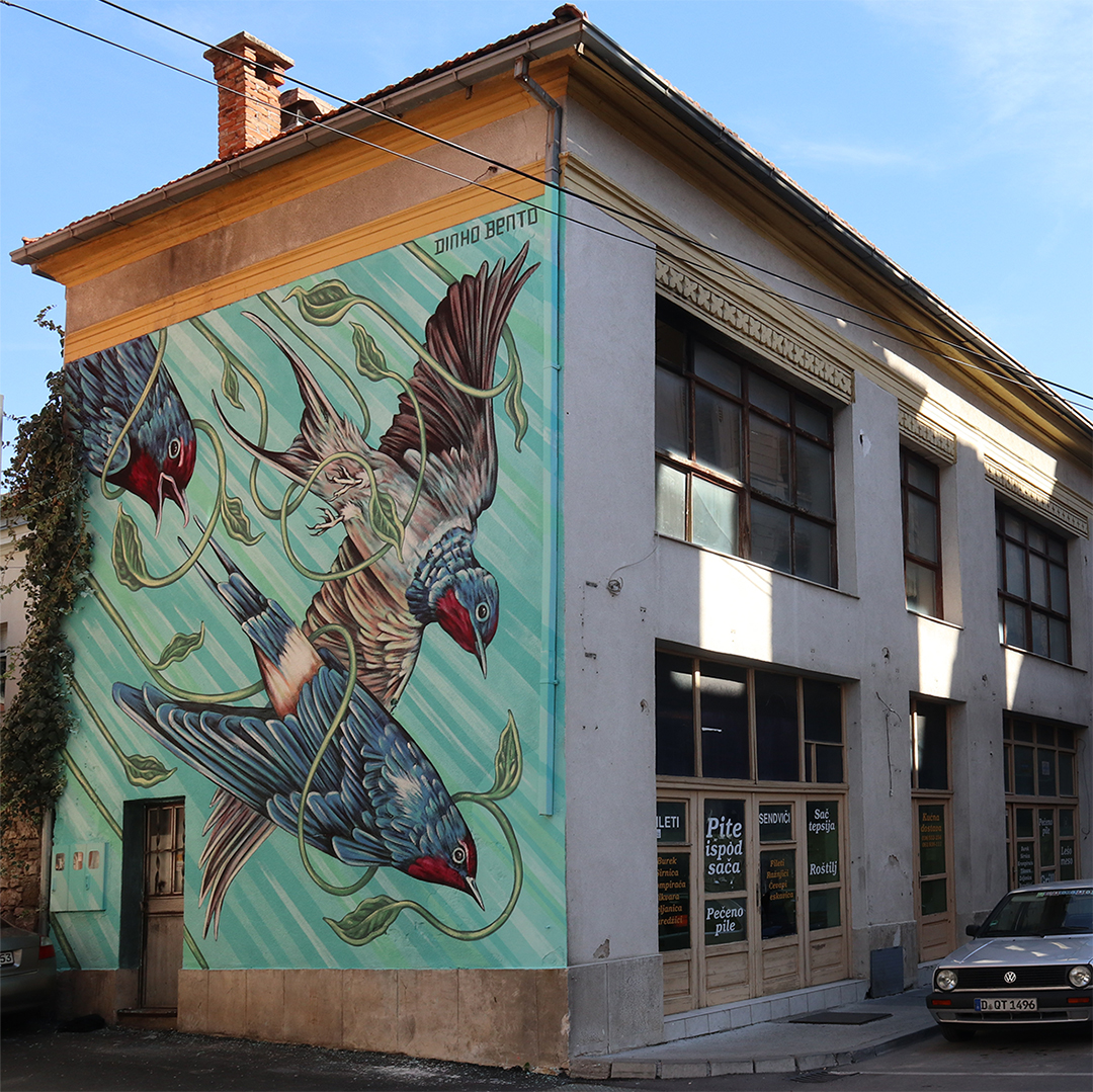 Reconnu internationalement comme muraliste, Dinho Bento réalise des projets dans plusieurs pays, tout en poursuivant une pratique d’atelier parallèle centrée sur la recherche technique et matérielle. Cette dualité entre art public et production en studio constitue un élément central de sa démarche, créant un lien esthétique et conceptuel entre ses fresques monumentales et ses œuvres sur toile.