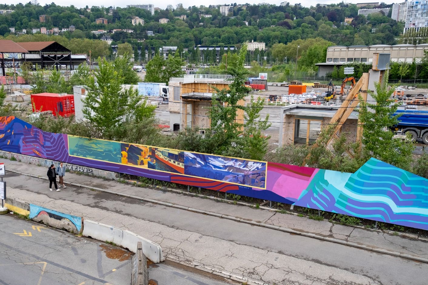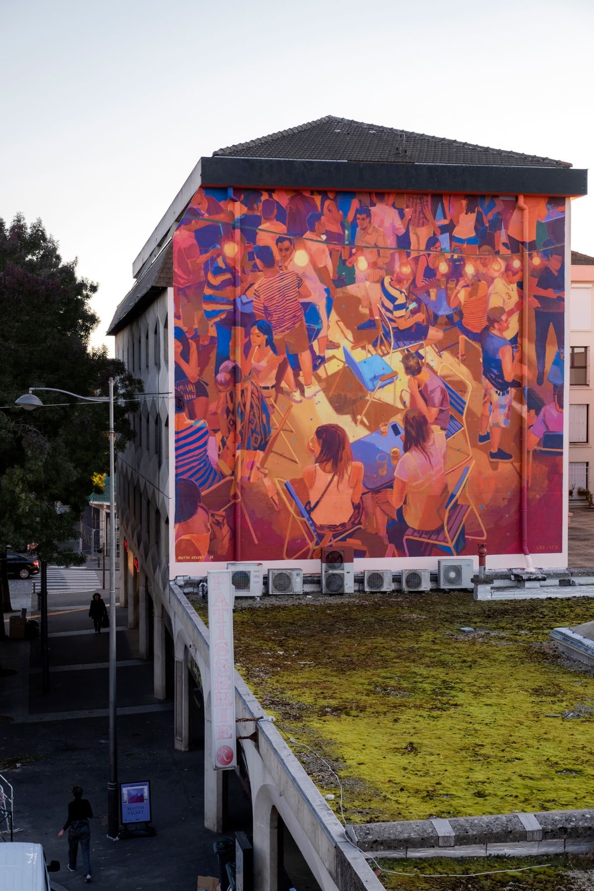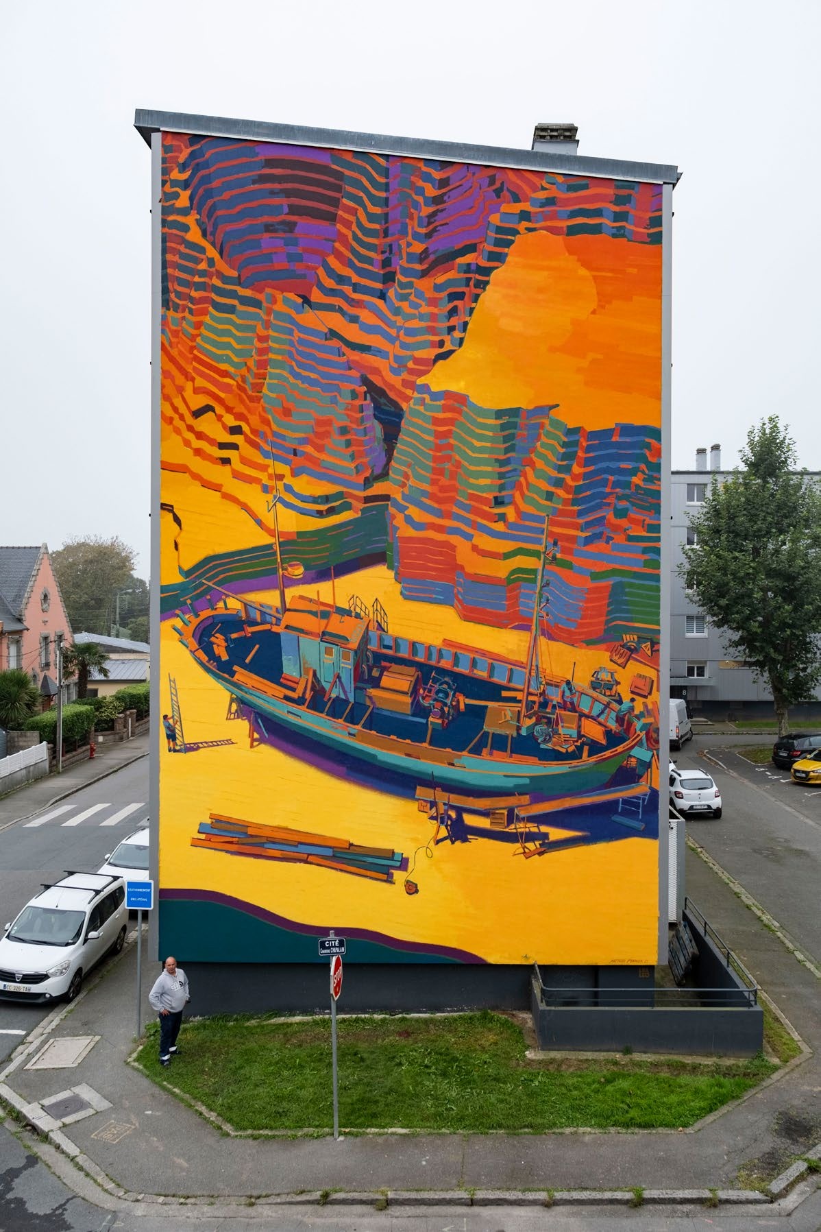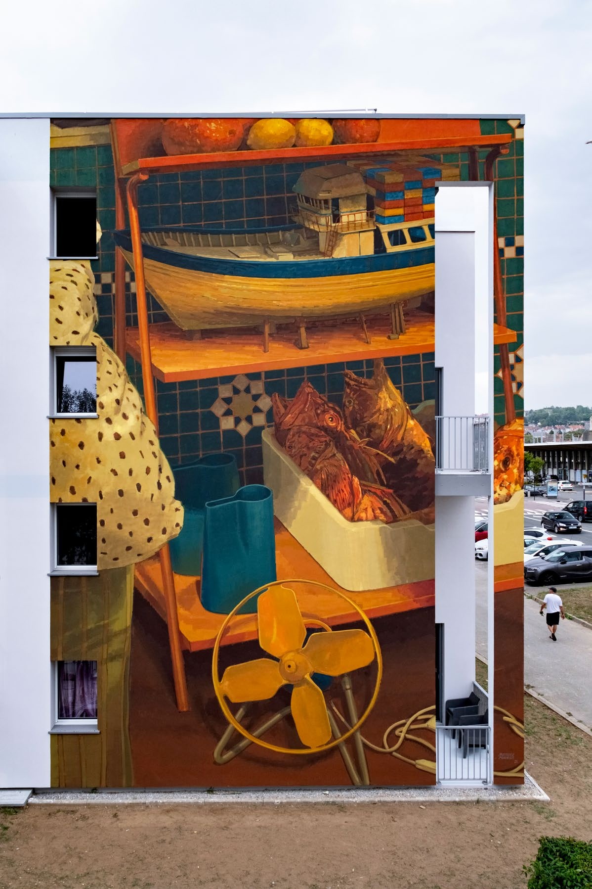 Parallèlement à son travail sur toile, il réalise également des fresques murales dans lesquelles il transpose cette même approche picturale, mêlant héritage du graffiti, sens de la composition et recherche narrative.