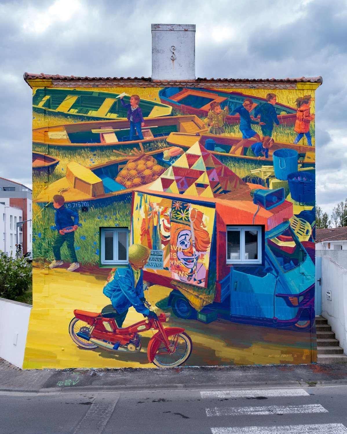 Aujourd’hui, Matthieu Pommier poursuit une pratique artistique qui se déploie entre peinture d’atelier et interventions murales, développant un langage visuel personnel où couleur, narration et poésie du quotidien occupent une place centrale.