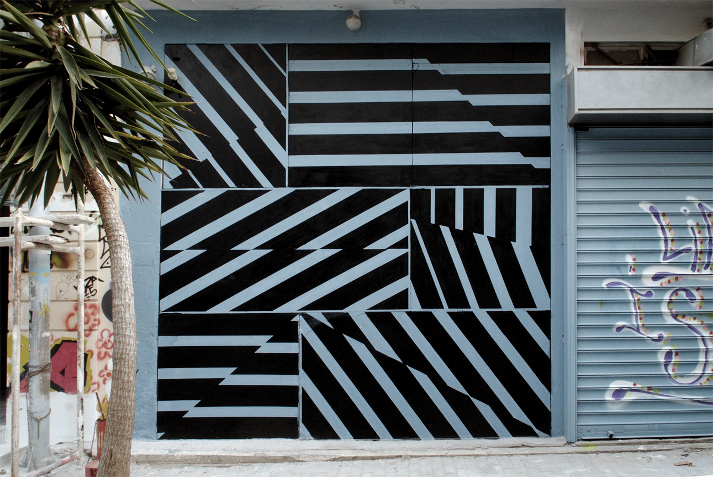 As a graphic designer he works primarily in branding identity, apparel design, music albums and books. He has been experimenting with graffiti and street art since early 2000 and he took up painting and photography in 2009. His work has been exhibited around the world and many of his murals can be viewed (if you know where to look) in streets, buildings & abandoned spaces. He has collaborated with clients & Museums such as Adidas, Nike, COMME des GARÇONS, Vodafone, Grand Hyatt, Four Seasons Hotel, Amara Hotel, Selina Hotels, Workstead,Ucon Acrobatics, Brown University, Onassis Stegi, Benaki Museum, Wilhem Hack Museum. From 2011 collaborating with the artist Greg Papagrigoriou under the name of Blaqk.